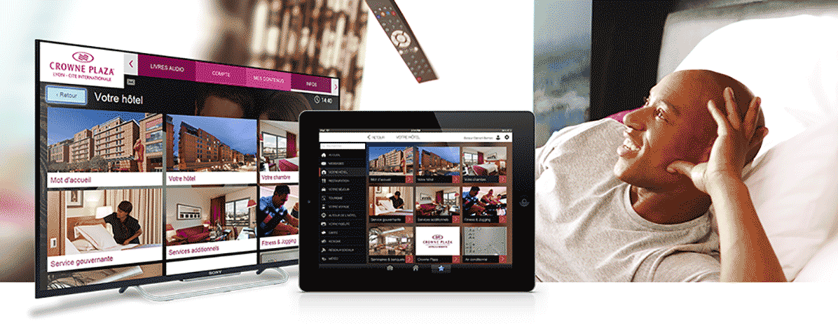 Comme sur la TV connectée, vous donnez l’accès à des média en ligne (résultats sportifs, météo, bourse…), au site internet de l’établissement et à votre sélection de sites partenaires.