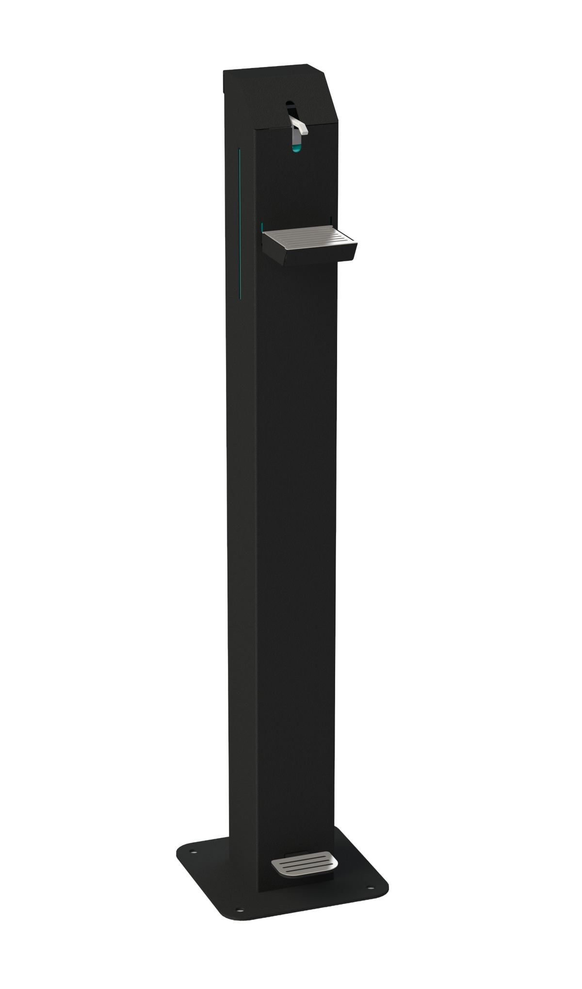 Dans ce domaine nous proposons une offre « made in France », très simple d’utilisation, facile à déployer dans les lieux de passages stratégiques de l’entreprise, avec un design soigné qui permet à la fois un accès simple et rapide au bac de rechargement Inox, et une opération de nettoyage et de désinfection totale. La pédale garantie une utilisation sans contact, la borne peut être fixée au sol et ainsi permettre un usage en toute sécurité.