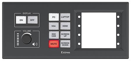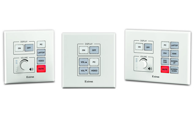 Extron propose une gamme complète de 6 à 14 boutons qui sont autant de fonctions associées à la commande de tel ou tel équipement audiovisuel.